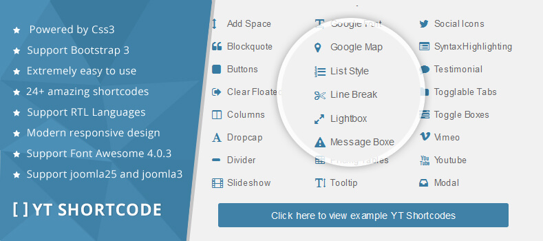 The shortcodes supports users to make content for web pages. In Joomla administrator, Yt Shortcodes button will be appeared below the text-area, you can choose shortcodes for the text-area to make content. We will show bonus pages for sample in some templates using shortcodes from now.