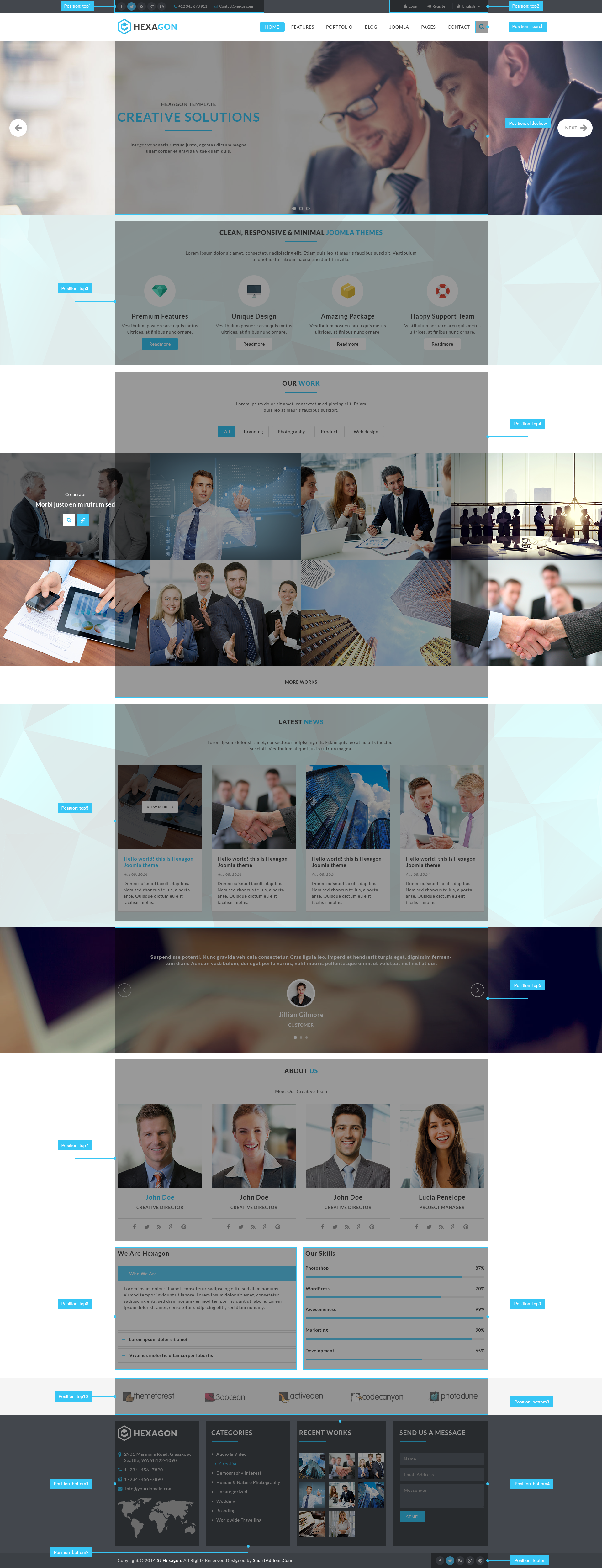 This Joomla! template supports a wide variety of module positions which can be archived automatically by the system.The module positions are fully collapsible mean that if there are no modules published in particular position, this module position will disappear and the other modules with take this place. Also you can have 2-Columns layout (content, left or right)